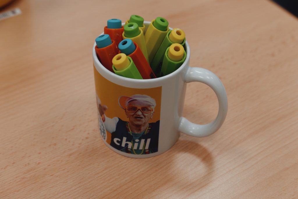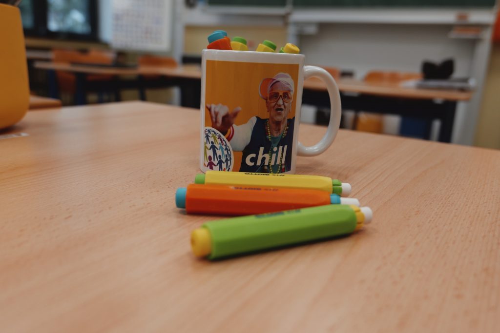 In einer Tasse liegen neun Kreidehalter – jeweils mit Kreide bestückt. Keine losen Stücke mehr an der Tafelleiste. Keine Brösel.