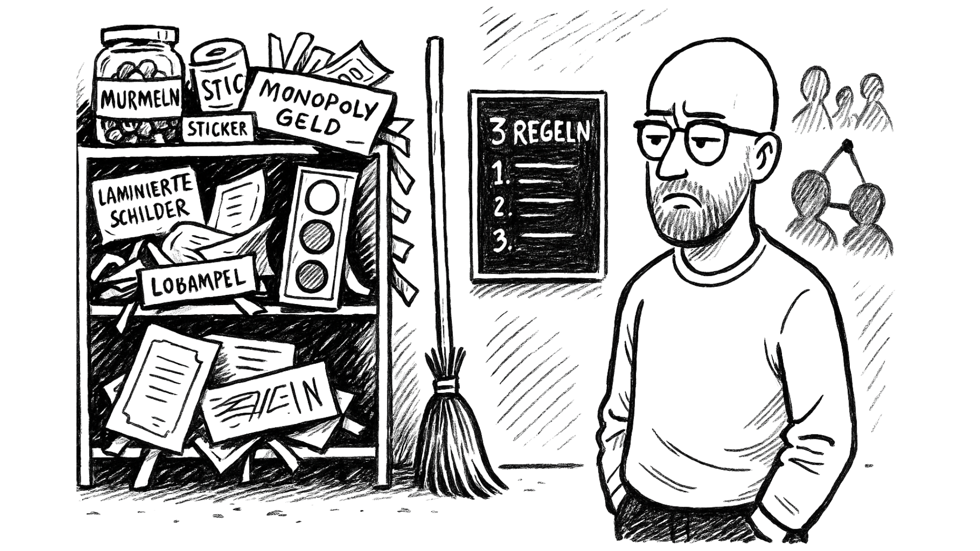 Ich hab inzwischen im Klassenraumschrank ein ganzes Fach für gescheiterte Management-Tools – alle einmal gehypt, alle tot. Ein Friedhof voller Stickerkarten, Schilder und Lobampeln.