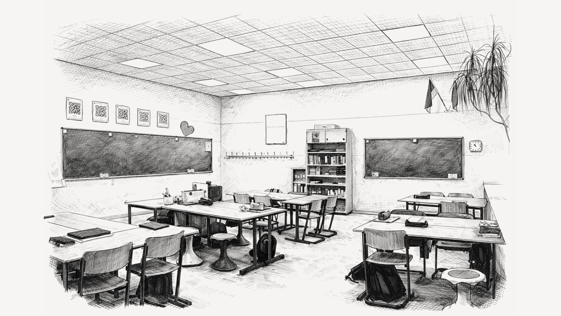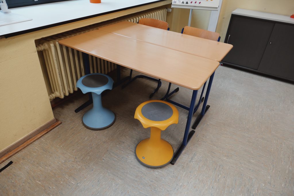 Der Raum ist als Gruppensetting angelegt. Keine klassischen Reihen, keine dauerhafte Frontausrichtung. Ich sitze als Teil der Lerngruppe im Raum, mit einem seitlich integrierten Lehrerpult an einem Gruppentisch. Diese Position erlaubt es mir, während Arbeitsphasen zentral präsent zu sein und gleichzeitig eine frontale Option bereitzuhalten, sodass der Raum auch für konventionellen Unterricht meiner Kolleg:innen genutzt werden kann, ohne jedes Mal umgebaut zu werden.